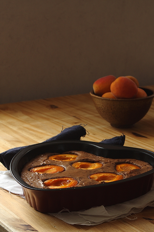 Jakiś czas temu widziałam zdjęcie tego brownie clafoutis na blogu Madame Gateau i to była tylko kwestia czasu, kiedy je sama zrobię. U mnie w wersji z morelami ( nawiasem mówiąc bardzo udane połączenie ). Rzeczywiście brownie clafoutis smakuje jak brownie, jest dość syte, intensywnie czekoladowe. Moim zdaniem deser lepiej prezentowałby się w mniejszych, osobnych foremkach / ramekinach, byłby wtedy również bardziej wygodny w konsumpcji. Przepis godny polecenia, szczególnie w momentach nieokiełznanej i nieodpartej ochoty na czekoladę – wiecie co mam na myśli ;-)