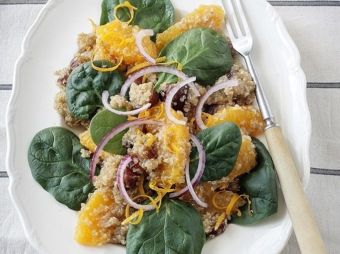 Sałatka z komosy ryżowej ze szpinakiem, pomarańczą i daktylami