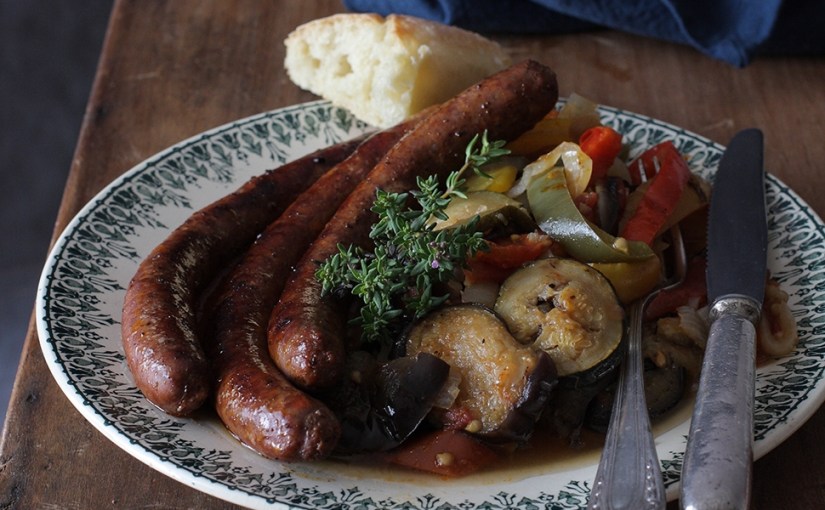 Ingredients: {serves 6 or more} 500g eggplants, 500g zucchinis, 500g peppers (green, yellow and red), 500g tomatoes, 3 onions, 3 cloves of garlic, 1 bouquet garni, 100ml olive oil, salt and pepper. Merguez sausage – optional.