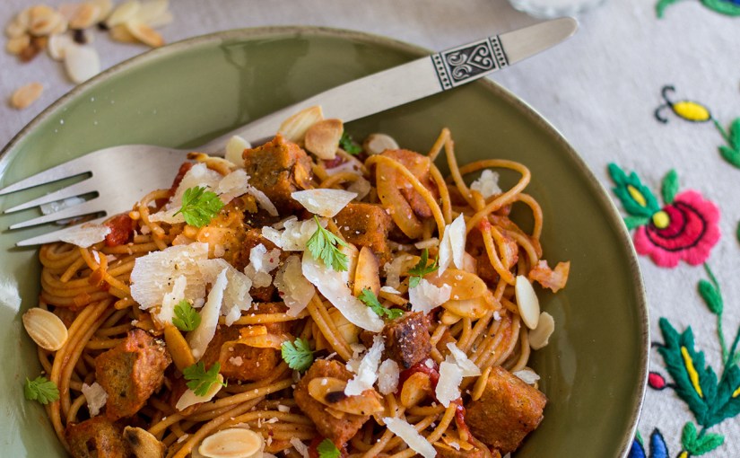 Składniki dla 3 – 4 osób: 5 łyżek oliwy, 1 cebula pokrojona w cienkie krążki, 500g pomidorów z puszki, około 400g makaronu (u mnie pełnoziarniste spaghetti), 100g migdałów (całych bez skórki lub w płatkach), 4 grube kromki czerstwego chleba, 75g Parmezanu, sól i pieprz