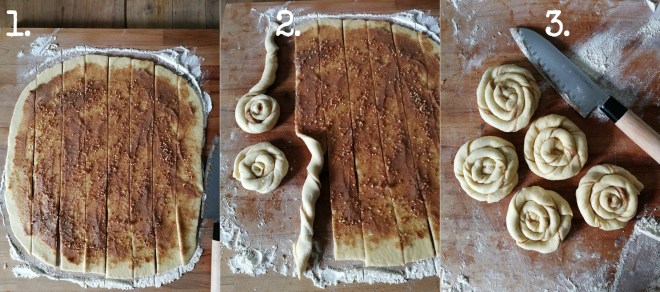 Wyrośnięte ciasto przekładamy na posypany mąką blat. Wałkujemy na duży prostokąt grubości około 0,5cm. Wierzch smarujemy nadzieniem i kroimy na szerokie paski (1.)