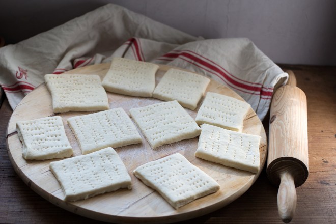 Przekładamy wyrośnięte ciasto na blat posypany mąką i wałkujemy placek grubości około 0,5 cm. Za pomocą noża lub np. miseczki z cienkim brzegiem wykrawamy okrągłe lub kwadratowe porcje. Nakłuwamy je widelcem i odstawiamy na kolejne 30 minut.