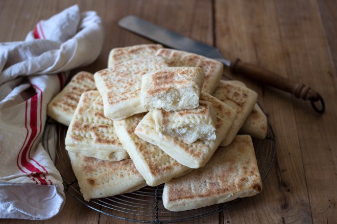 Rozgrzewamy suchą patelnię i smażymy chlebki z dwóch stron, około 1 minuty z każdej, aż wierzch się ładnie zarumieni. Zdejmujemy z patelni i studzimy na kratce.