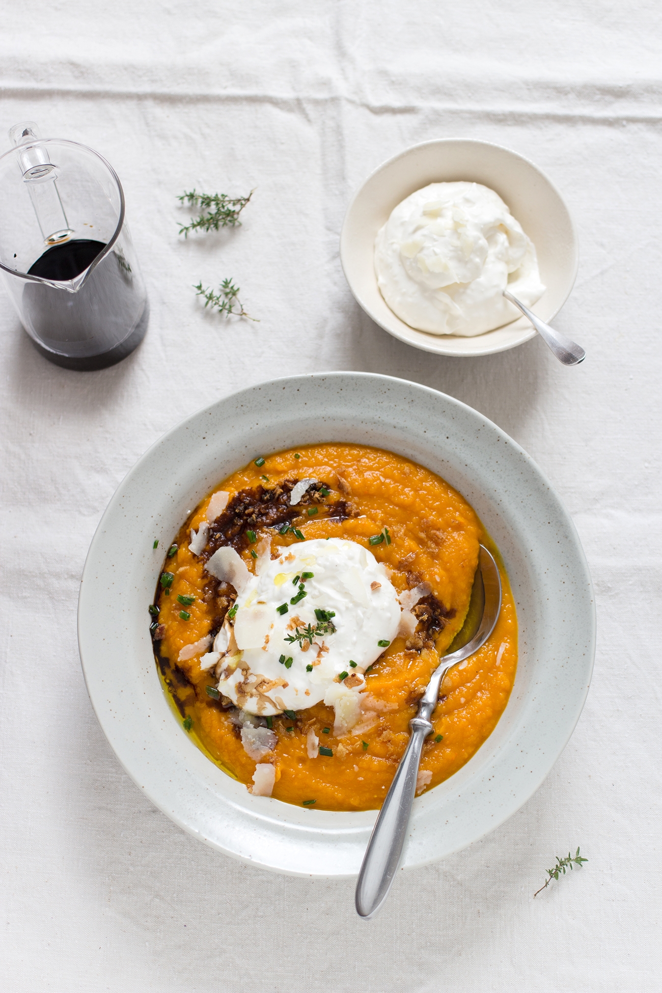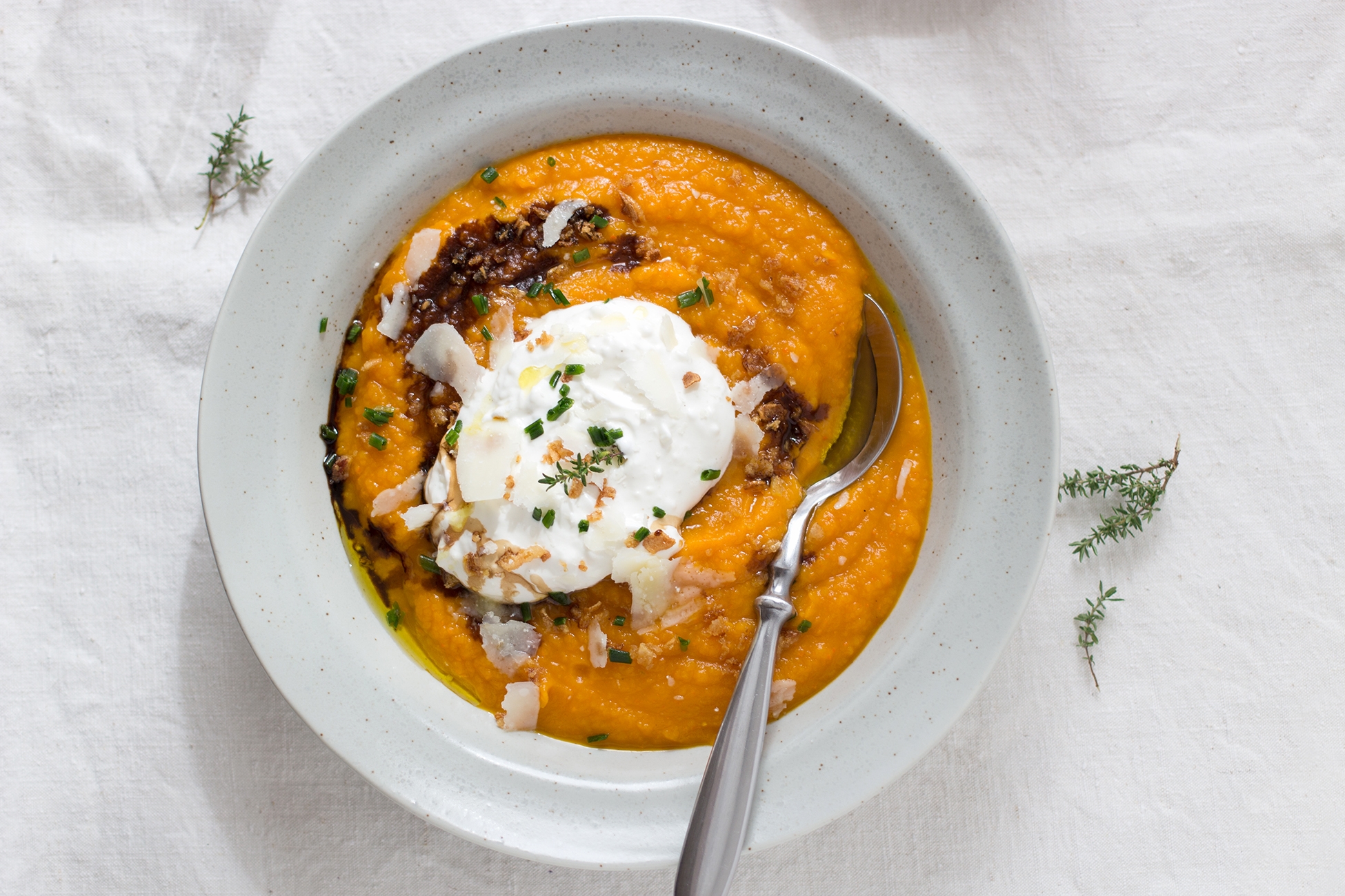 Gęsta zupa z batatów z grzankami, boczkiem i rodzynkami