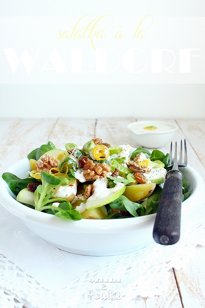 Tradycyjna Waldorf salad składa się z jabłka, selera, majonezu i orzechów włoskich, ułożonych na liściach sałaty. Ja proponuję Wam dzisiaj sałatkę w nieco wzbogaconym, ale i odchudzonym wydaniu. Dzięki ziemniakom ugotowanym w koszulkach potrawa zamienia się w całkiem pożywny posiłek. Majonez zastąpiłam lekkim sosem jogurtowym, a dotatek grillowanych orzechów i słodkich rodzynek wspaniale wzbogaca i urozmaica smak. Ja nie mogłam się oprzeć i zjadłam sporą dokładkę ;-) Oto moja propozycja na pyszny i zdrowy, wiosenny posiłek.