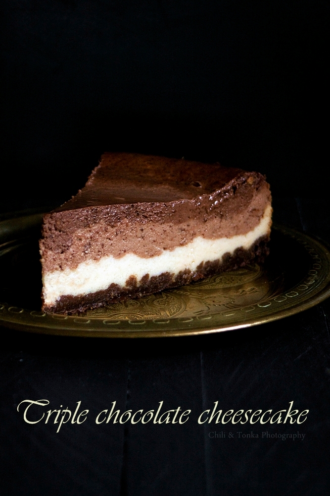 Sernik potrójnie czekoladowy – czy muszę pisać więcej? Gorzka, ciemna czekolada świetnie kontrastuje z łagodnym smakiem białej i mlecznej części masy. W mojej, lekko odchudzonej wersji ten serniczek jest mało słodki i niezbyt syty – w sam raz dla dorosłych smakoszy, szczególnie tych dbających o linię. Polecam! Jeśli nie do końca jesteście pewni, spójrzcie jeszcze raz: